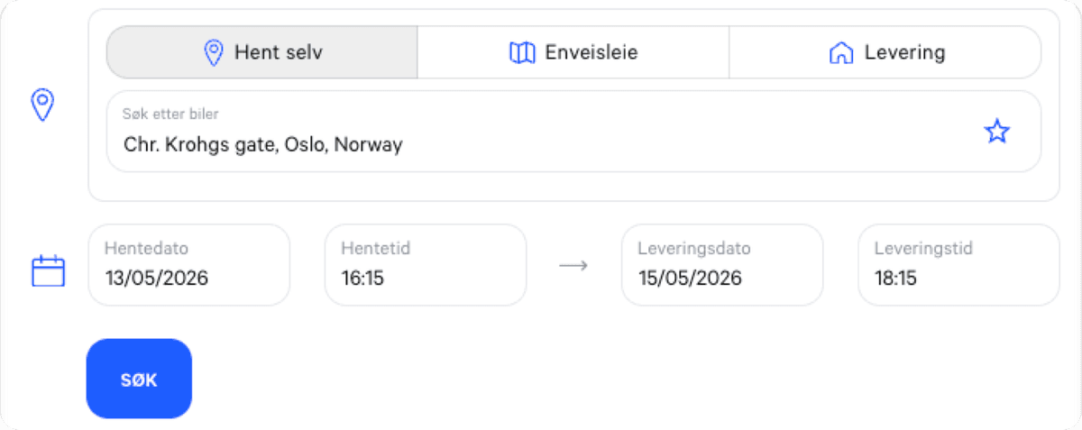 Velg levering og retur, både for hjemlevering og enveisleie